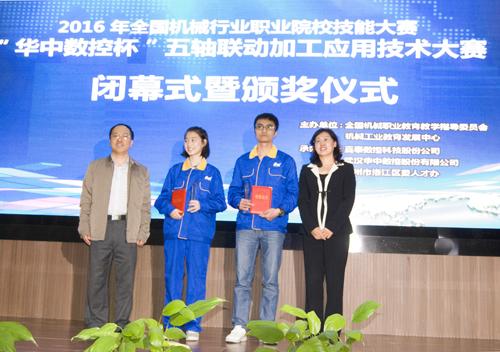 一場才智與體力的“比拼廝殺”,四項五軸數(shù)控專業(yè)高技能的“終極考驗”,五臺高速高精度五軸數(shù)控機(jī)床的“電光火石”,二十支國內(nèi)機(jī)械高校隊伍的“華山論劍”,為期五天的“華中數(shù)控杯”五軸聯(lián)動加工技術(shù)應(yīng)用大賽終于在嘉泰數(shù)控產(chǎn)業(yè)園落下帷幕,經(jīng)過激烈的角逐,最終來自武漢市第二輕工業(yè)學(xué)校和湖南工業(yè)職業(yè)技術(shù)學(xué)院分別斬獲中職組和高職組的冠軍,贏得五軸技術(shù)大賽“王者”頭銜!而中職組的蘭州市工業(yè)職業(yè)技工學(xué)校兩組選手分列二、三等獎;高職組的遼寧建筑職業(yè)學(xué)院、福州職業(yè)技術(shù)學(xué)院、常州輕工職業(yè)技術(shù)學(xué)院、湖南工業(yè)職業(yè)技術(shù)學(xué)院、長春職業(yè)技術(shù)學(xué)院、泉州信息工程學(xué)院的幾組選手,分別獲得二、三等獎。![]() 圖:全國機(jī)械職業(yè)教育教學(xué)指導(dǎo)委員會秘書長、機(jī)械工業(yè)教育發(fā)展中心副主任鄭麗梅(右)和泉州市洛江區(qū)委常委組織部部長廖曉凌(左)為一等獎獲獎?wù)哳C獎 圖:嘉泰數(shù)控科技股份公司董事長蘇亞帥(左)和武漢華中數(shù)控股份有限公司副總裁熊清平(右)為二等獎獲得者頒獎 2016年11月22日-26日舉辦的2016年全國機(jī)械行業(yè)職業(yè)院校技能大賽--五軸聯(lián)動加工技術(shù)應(yīng)用大賽是中國機(jī)械行業(yè)職業(yè)院校的頂尖賽事,而五軸數(shù)控機(jī)床在各技術(shù)層面處于數(shù)控機(jī)床行業(yè)“金字塔”的王者頂端,而參賽的選手均是全國各職業(yè)院校的“佼佼者”,這就是本次“不同尋?!钡拇筚惛咭?guī)格和高水平。