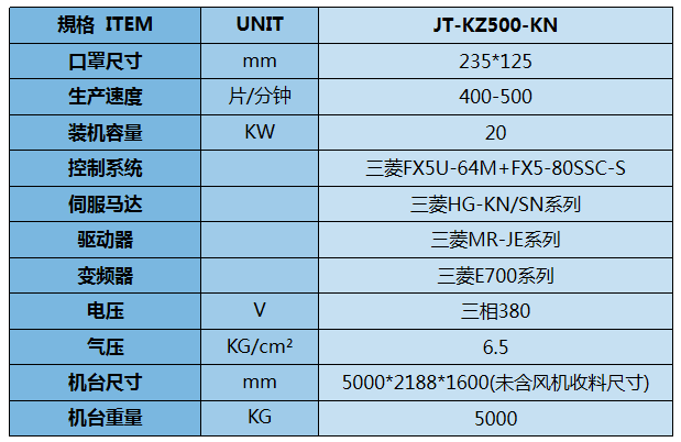 高速智能KN95口罩制片機(jī)JT-KZ500-KN是一臺(tái)全自動(dòng)化智能化的KN95口罩制片機(jī),設(shè)備通過送料系統(tǒng)、布料成型系統(tǒng)、鼻梁條成型切割系統(tǒng)等工序的配合,生產(chǎn)出蝶形口罩的主體。整機(jī)從入料、鼻線插入、成型、裁切成品均為自動(dòng)化作業(yè),每分鐘可生產(chǎn)500片以上。該生產(chǎn)設(shè)備性能穩(wěn)定,產(chǎn)量高,良率高,易于操作。生產(chǎn)的KN95口罩佩帶舒適,口罩過濾效果好,契合人的臉型。