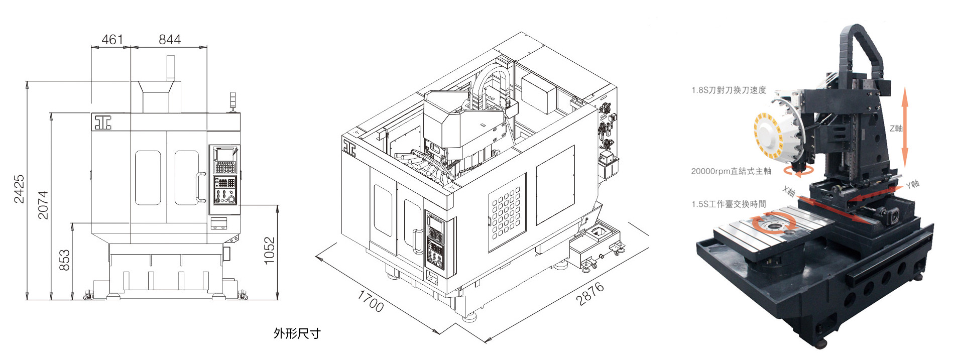 產(chǎn)品特點:整機三軸行程疊加式動柱結(jié)構(gòu),可實現(xiàn)工作臺回轉(zhuǎn)的同時,三軸、主軸、附加軸的定位和刀具交換;節(jié)省工作臺交換的時間,實現(xiàn)無停頓加工,提高了有效加工的時間。